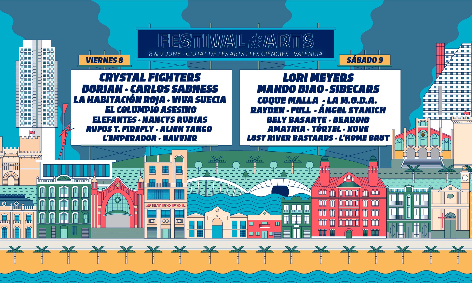 Desde sus inicios en 2015, el Festival de les Arts ha dado a los valencianos el placer de tener un festival al lado de casa y, para muchas bandas, la oportunidad de compartir cartel con artistas internacionales de la talla de The Wombats y Everything Everything en la primera edición, The Fratellis y Hurts en la segunda y Jake Bugg y The Vaccines en la tercera. Tenemos que reconocer que el festival ha cambiado a lo largo de los años y este año ha apostado casi a conciencia por grupos españoles y, sobre todo, de Valencia, que darán apoyo a las bandas internacionales Crystal Fighters y Mando Diao y a los platos fuertes españoles Dorian y Lori Meyers.
