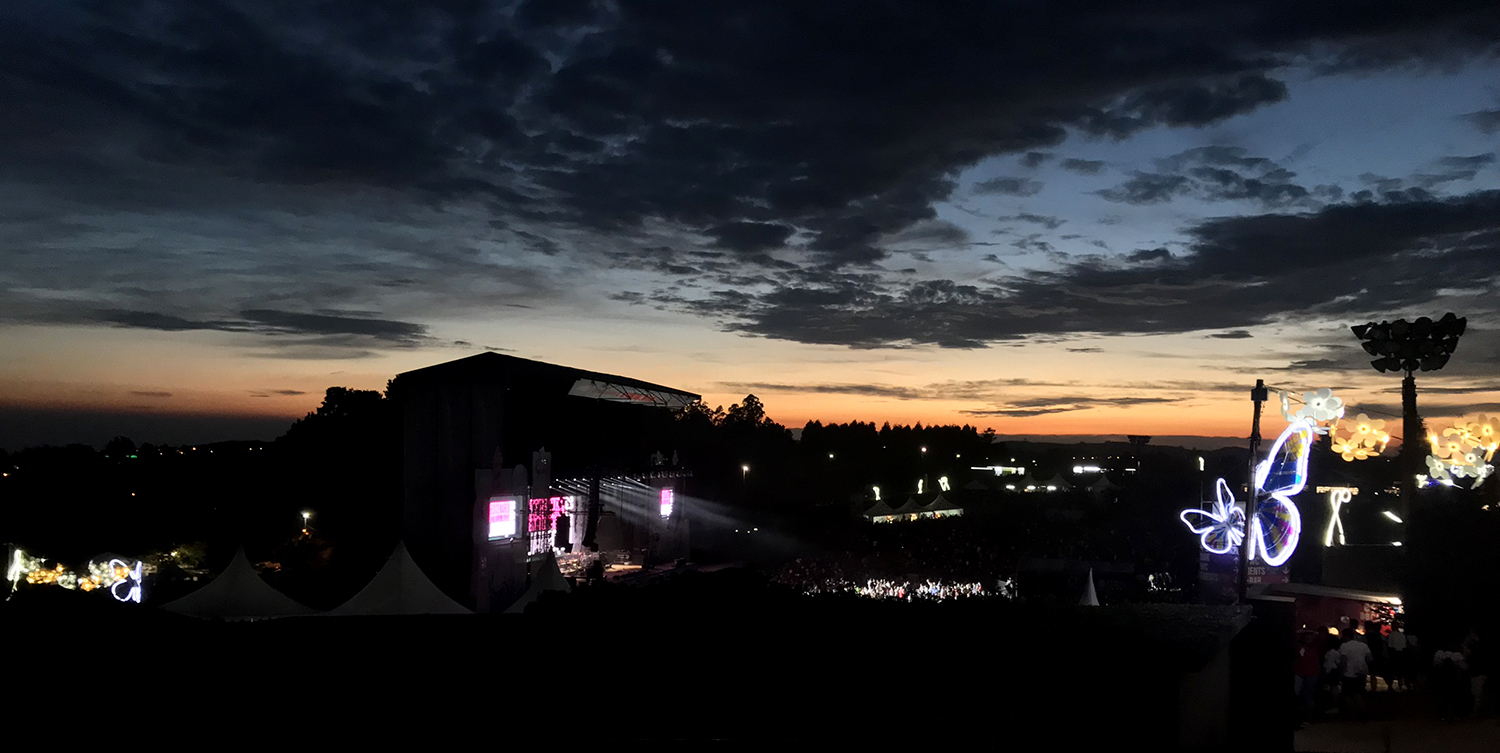 Después de pasarnos toda la jornada merodeando de escenario a escenario (y subiendo la cuesta del recinto) Decidimos pasar de las aglomeraciones infinitas del escenario principal y vimos a Jamiroquai desde la parte más alta del monte, dónde teníamos una panorámica perfecta. Eran casi las 11 de la noche y prácticamente había anochecido hacia un momento.