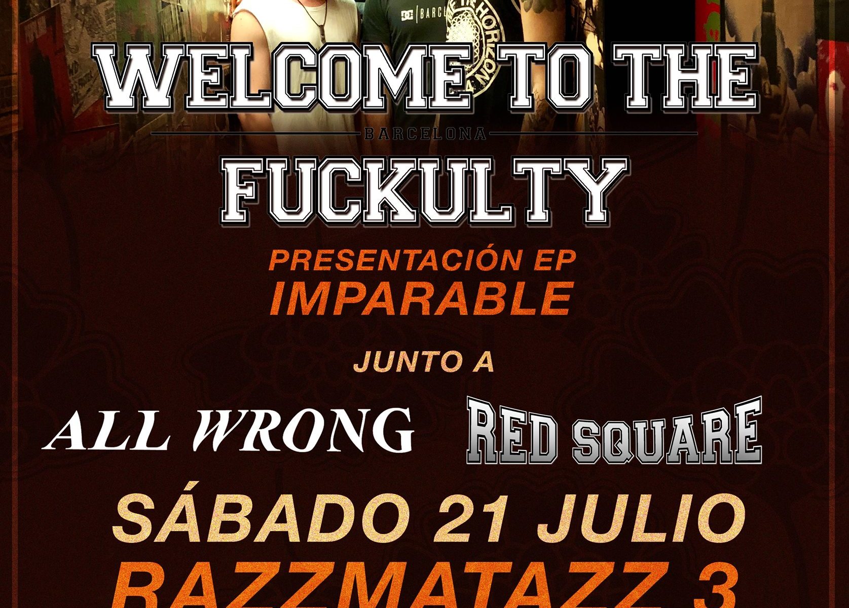 El 21 de Julio tuvimos una cita muy interesante con Welcome to the Fuckulty en una de las salas más emblemáticas de Barcelona, Razzmatazz 3, donde nos presentaron su nuevo trabajo Imparable, junto a los grupos invitados All Wrong, que con solo su primer EP ya han conseguido tocar junto a las bandas locales más conocidas del pop – punk; y Red Square, uno de los grupos del mismo género musical que ya cuenta con mucha experiencia en los escenarios y son muy conocidos por el culto a los videojuegos y a los años 80.