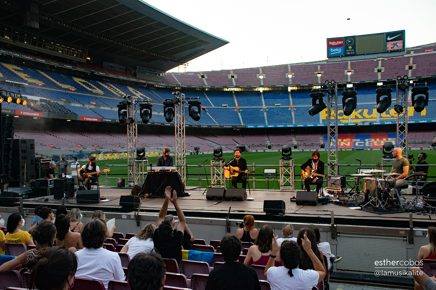 Dejé a Esther para que ella se adentrase como fotógrafa y yo me metí en los túneles del Camp Nou para encontrar mi sitio. Subiendo y bajando escaleras junto a la amabilidad de los voluntarios que nos atendían dentro, llegué a nuestro sitio y, sin mentiros, teníamos unas vistas descomunales. El sol estaba empezando a caer por encima del campo y los reflejos de luces estaban predestinando a una noche con la que nos íbamos a emocionar de lo lindo. Durante la espera sonaban canciones de grandes artistas como Lildami o Rayden, pero el momento llegó cuando empezaron a sonar las notas de “la vida es bella” y vimos entrar a Rafa, Rodrigo, Fer, Jess y Alberto con ese aura que les caracterizaba y yo pensé: se viene.